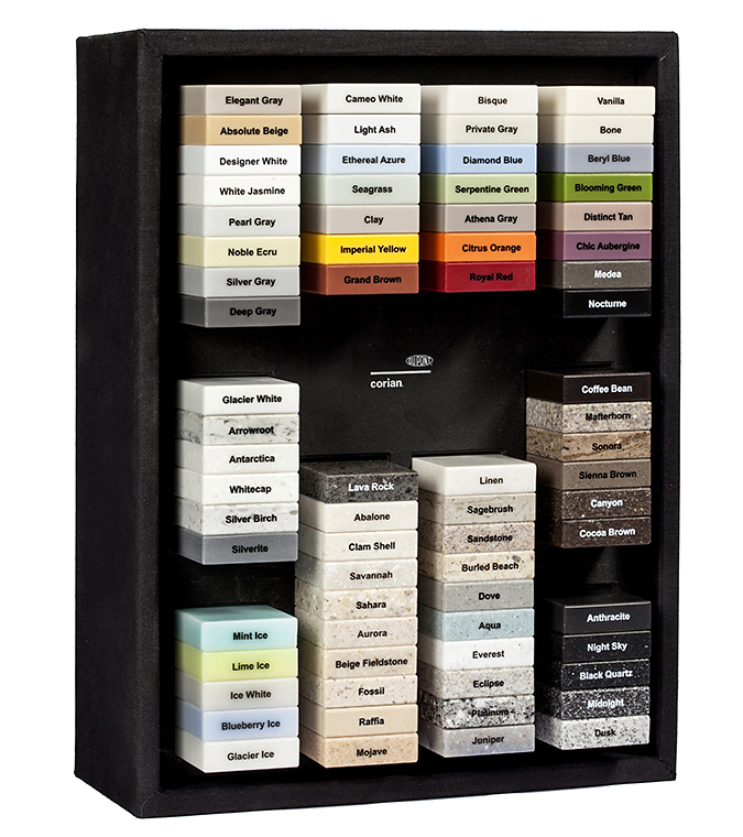 Corian är ett kompositmaterial som består av 2/3 delar naturliga mineraler och 1/3 del akryl samt pigment. Kan sammanfogas utan synliga fogar, vilket gör, att det inte bildas skarvar som samlar smuts och bakterier. Gediget material som känns varmt vid beröring och har djup luminiscens.